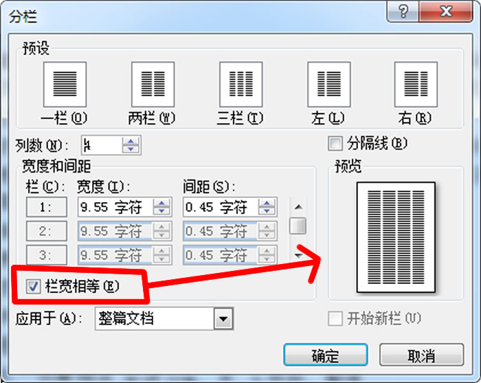 6、勾选栏宽相等时,每个分栏的宽度是相等的。