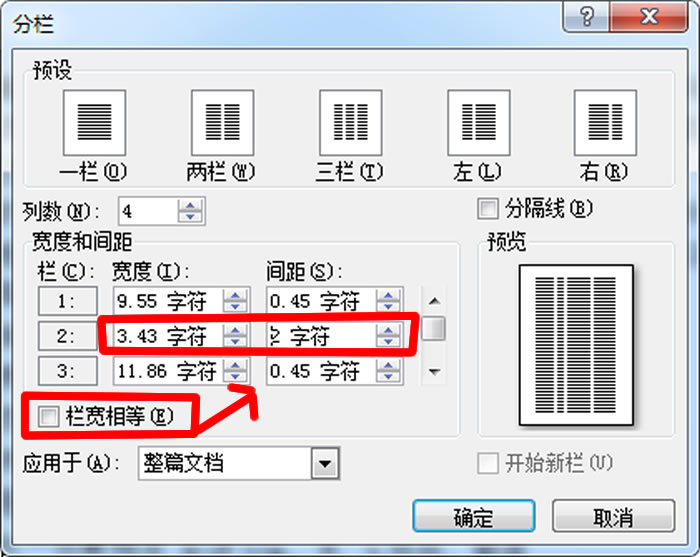 7、当取消栏宽相等时,可以在上面调节每栏的宽度和间距。比如小编分成四栏,将第二栏的宽度调小,结果如下图。